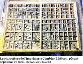 *** Marine Issartel a fait plusieurs erreurs dans le dernier paragraphe : l'achat chez Combier remonte à plus de 30 ans et les prix estimés sont pour des polices neuves (je n'ai jamais acheté que des casse d'occasion au prix du plomb, actuellement aux environs de 1,00 € le kg) ; une casse peut peser de 3 à 7 kg et l'impression d'un livre peut s'étaler sur six mois ; enfin si je suis bien en contact avec le Musée de l'imprimerie (par l'intermédiaire des Amis du Musée) je doute fort d'avoir dans ma « collection » grand-chose qui puisse l'intéresser ...