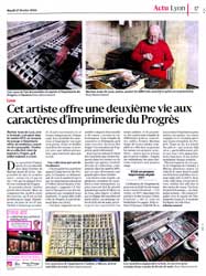 Des caractères d'imprimerie, il y en a des milliers dans l'atelier de Martian Ayme de Lyon. « Impossible de dire le nombre exact », avoue-t-il. Ce qui est sûr, c'est que la plupart d'entre eux viennent du Progrès. Au premier abord, l'atelier paraît désordonné. Mais on comprend vite, au fil de notre découverte, qu'il est en fait parfaitement rangé. Simplement, du haut de ses 87 ans, l'artiste a beaucoup accumulé. Il sait exactement où se trouve chaque œuvre, chaque outil. Pour atteindre les caractères d'imprimerie (ou types) et la presse, il faut se faufiler au milieu des cartons, et avancer avec une infinie précaution, sans renverser quoi que ce soit.