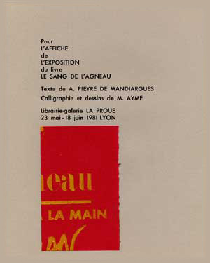 C'est pour l'exposition (Galerie La Proue, Lyon, 1981) de son livre d'artiste Le sang de l'agneau, texte de André Pieyre de Mandiargues, entièrement illustré et manuscrit par lui-même, que Martian AYME a réalisé cette plaquette. Elle reprend cinq dessins du livre, gravés sur bois de fil, du merisier en l'occurence, accompagnés chacun de la phrase correspondante du livre.