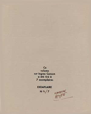 C'est l'un des quelques exemplaires imprimés sur vergé Ingres Canson de 100 g. de six couleurs qui est reproduit ici, en demi grandeur.