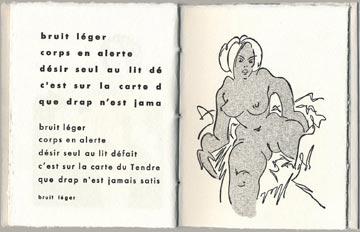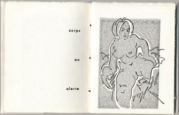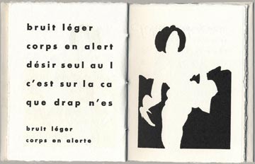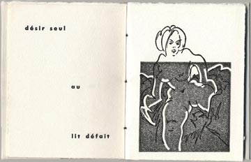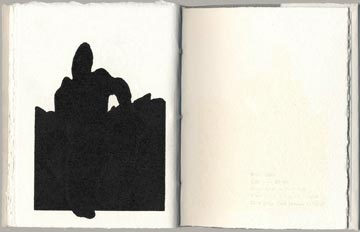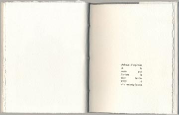 Typographie et impression en noir à la main par l'artiste sur Johannot 240 g, 28 pages, 10 exemplaires tirés à la main,10 gravures composites (lino & typo), texte en gestation en plusieurs corps, cousus sous toile grise et Johannot par l'artiste, 17 x 13 cm.