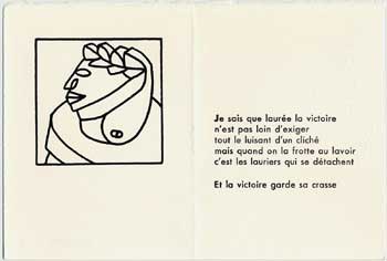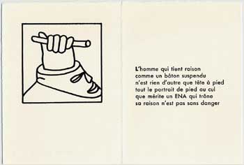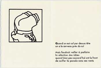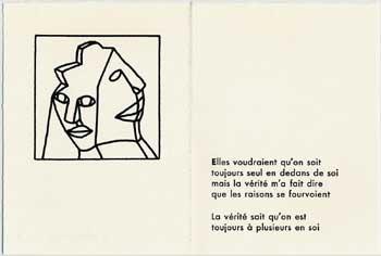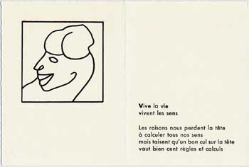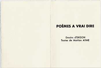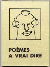 350 dessins, 70 textes en souffrance, c'était trop pour nos deux compères. Comme au fil des relectures s'était dégagée la cohérence de certains thèmes, ils ont élaboré le projet d'éditer, en l'imprimant eux-même, un recueil en sérigraphie et typographie. Leur choix s'est porté sur un ensemble qui oppose les froids excès d'une raison totalitaire à la liberté des sens. Le choix définitif de POÈMES À VRAI DIRE a été acquis en octobre 2005, la maquette établie en janvier 2006, et l'impression a pris environ un semestre... L'ensemble de l'ouvrage est reproduit sur cette page, les 33 pages imprimées ont été reproduites, en demi grandeur, et de façon à ce que le texte soit lisible.