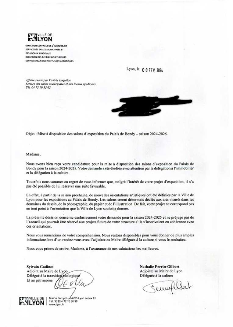 Après tant d'autres, dont la MAPRAA, notre bonne Municipalité a décidé d'exclure de son paysage culturel jusqu'à la Peinture lyonnaise. Pour preuve le courrier***, reçu par les divers Salons qui sont cette année (pour commencer ?) officiellement interdits de quai de Bondy, et que nous nous sommes procuré (en copie ci-après).